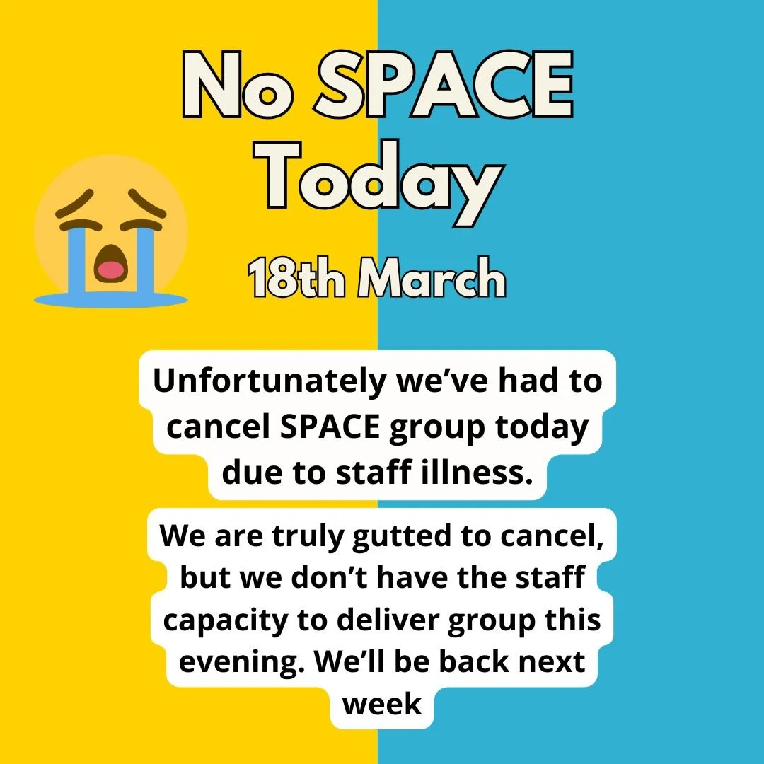 We run our SPACE session for young people aged 13-21 every Wednesday 6pm- 8pm in central Bath. Please contact us for the location.